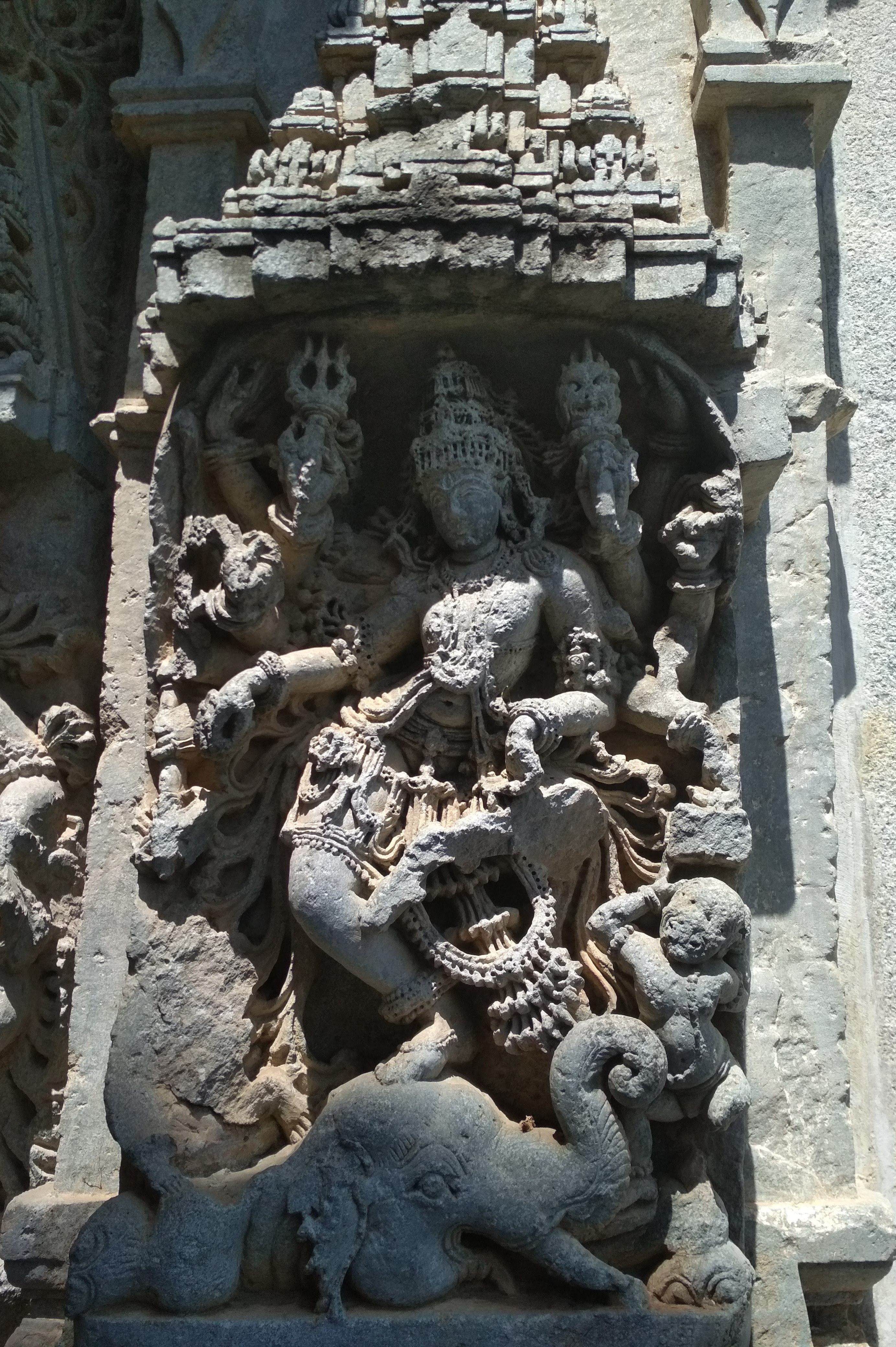 Most of these sites are located near Belur which was the first destination of our trip. While on the way to Belur from Hassan, the province capital, we stopped at the Doddagadduvalli. The town is home to temples from the Chalukya era with Laxmi mandir with 4 Garbhagruha (sanctums). The Dwarpals of Laxmi or Durga feature two Vetals with some truly amazing hairstyles (including breaded hair). The other three Garbhagrihas are dedicated to Shiva, Vishnu, and Parvati. Forming a quadrilateral of brother-sister (Shiva-Laxmi and Vishnu-Parvati) and husband-wife(Shiva-Parvati and Vishnu-Laxmi) relationships. This temple has historical importance and was once considered the second most important place of worship in the Chalukya Empire after the Laxmi Temple at Kolhapur.
